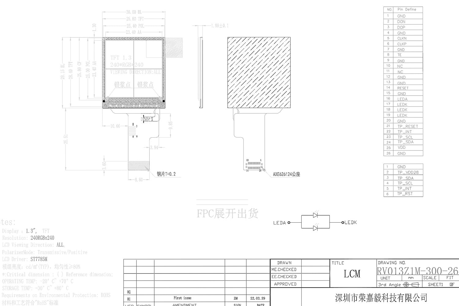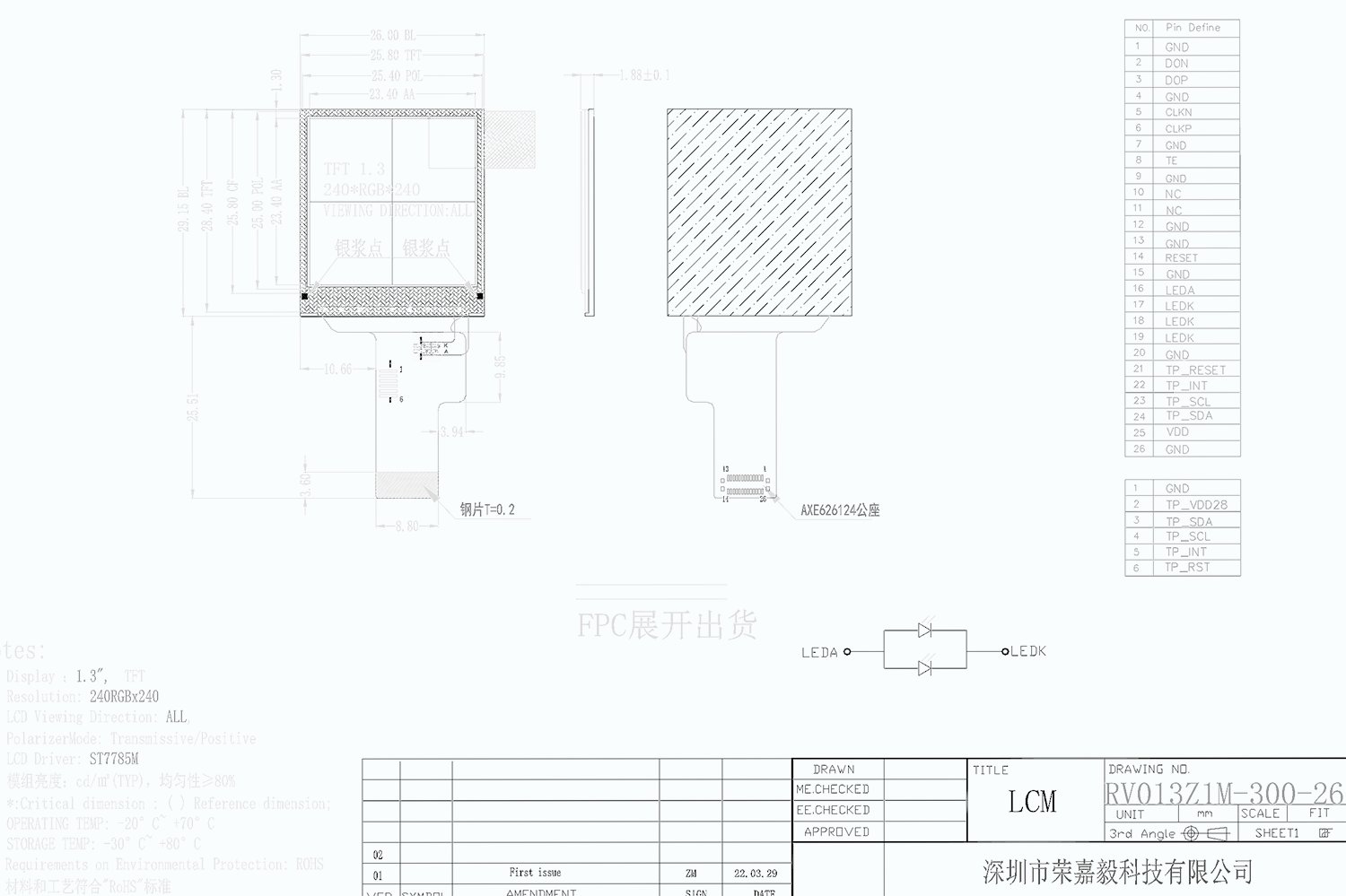 RV013Z1P-300-26 is a small size square 1.3 inch LCD display panel, the interface and brightness acceptable for customized, It is a transmissive type display operating in the normal white. This TFT-LCD has a 1.3 inch diagonally measured active area with QVGA resolutions (240 horizontal by 240 vertical pixel array).