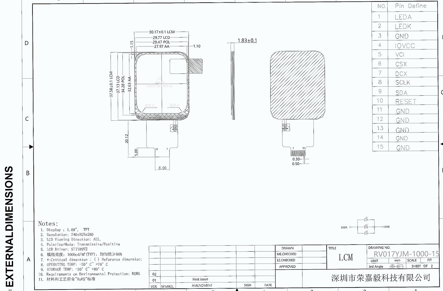 This is a 1.69-inch color TFT LCD panel with a resolution of 240×280 pixels, featuring an SPI interface. Designed for small-size applications, it is an ideal choice for smartwatches and control switch displays, such as outdoor street light control panels or coffee machine interfaces. The display is available in two variations: with or without a touchscreen, offering flexibility for different use cases.