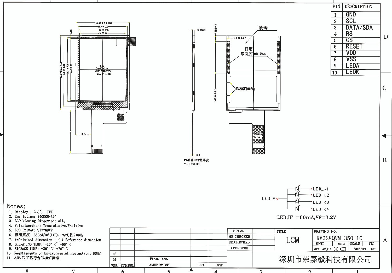 RV028QVP-350-10 is 2.8 inch square TFT Color LCD 240 * 320 pixel with Touch display module. It use ST7789 Driver IC and FT6336U Touch IC, LCD control board is acceptable custom according to your requirements.