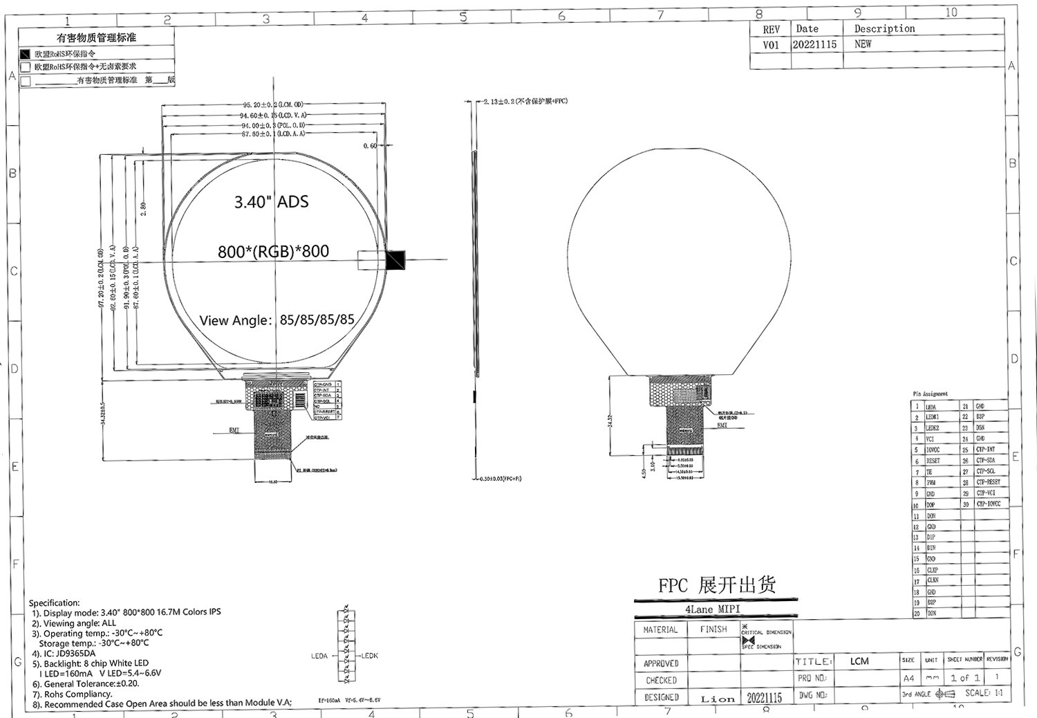 3.4-inch Round LCD Display – 800*800 Resolution, MIPI Interface