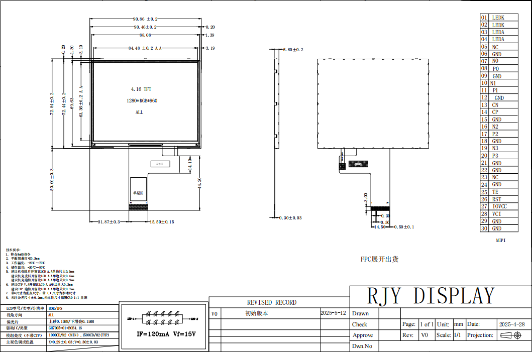4.16-Inch High-brightness IPS LCD Module – 1280×960 Resolution, MIPI Interface