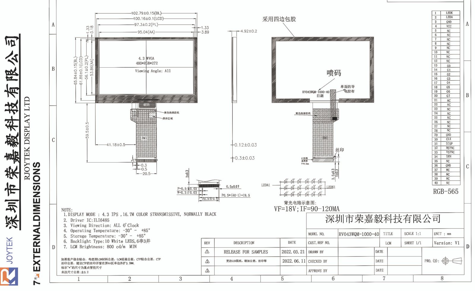 RV043WQM-1000-40 is a 480×272 pixel dots 4.3-inch color TFT lcd module display, if you need VGA video, AV signal driver board USB control board or HDMI board, please tell us, they will provide it according to your requirements.