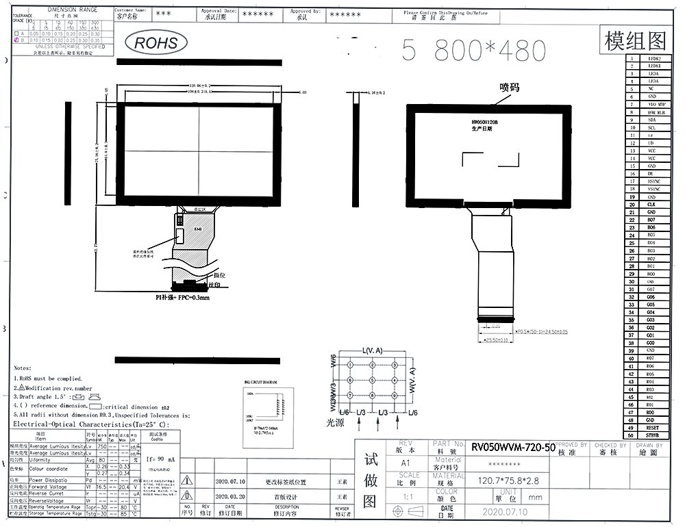 The model RV050WVM-720-50 is a color active matrix thin film transistor (TFT) liquid crystal display (LCD) that uses amorphous silicon TFT as a switching device. This model is composed of a TFT LCD panel, a driving circuit and a back light system. This TFT LCD has a 5.0(15:9) inch diagonally measured active display area with (800 horizontal by 480 vertical pixel) resolution.