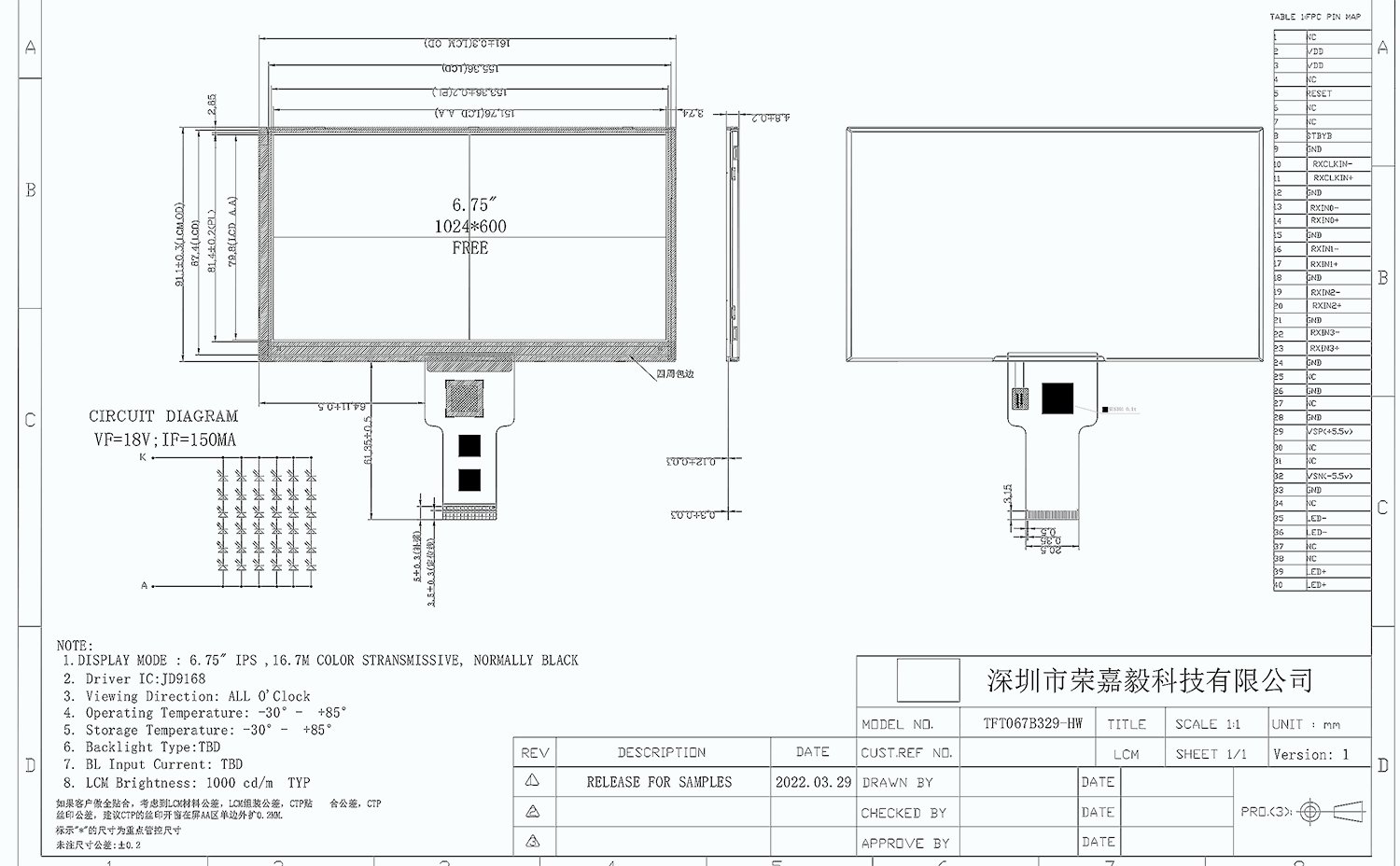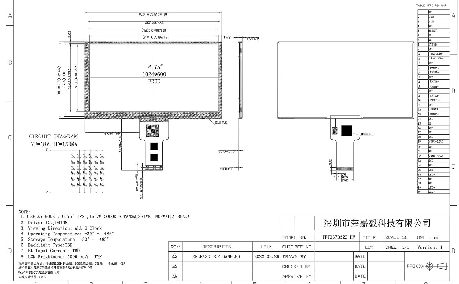 6.75 inch High-brightness TFT LCD Display – 1000nit Brightness, 1024*600 Resolution, LVDS Interface