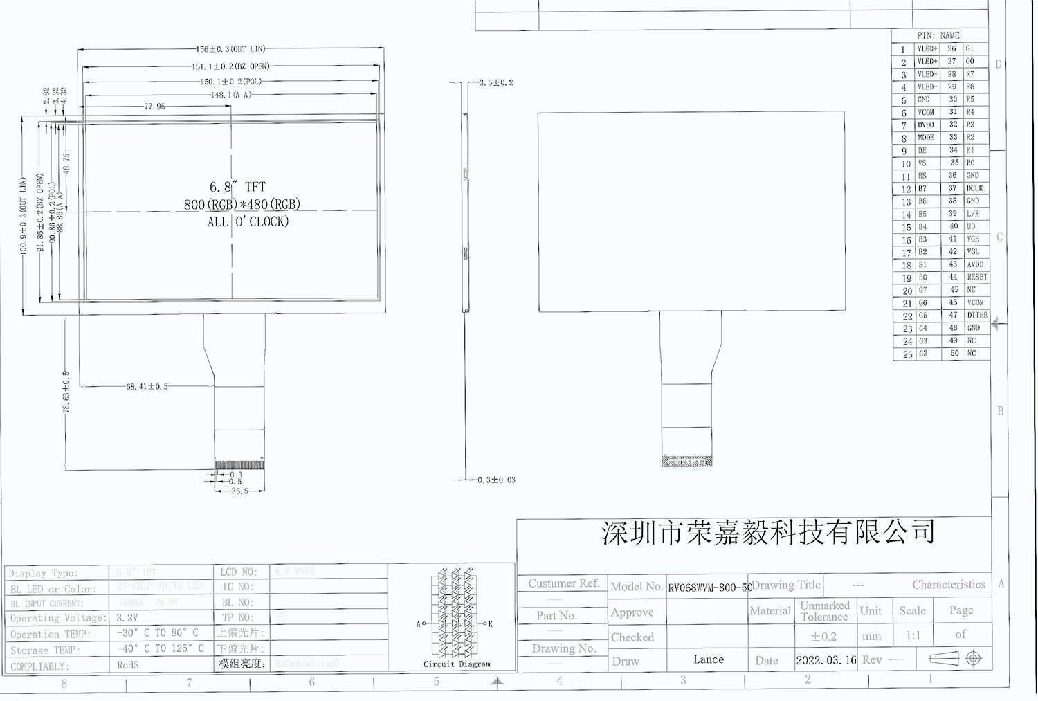 RV068WVM-800-50 is a color TFT-LCD Panel using amorphous silicon TFT’s (Thin Film Transistors) as an active switching devices.