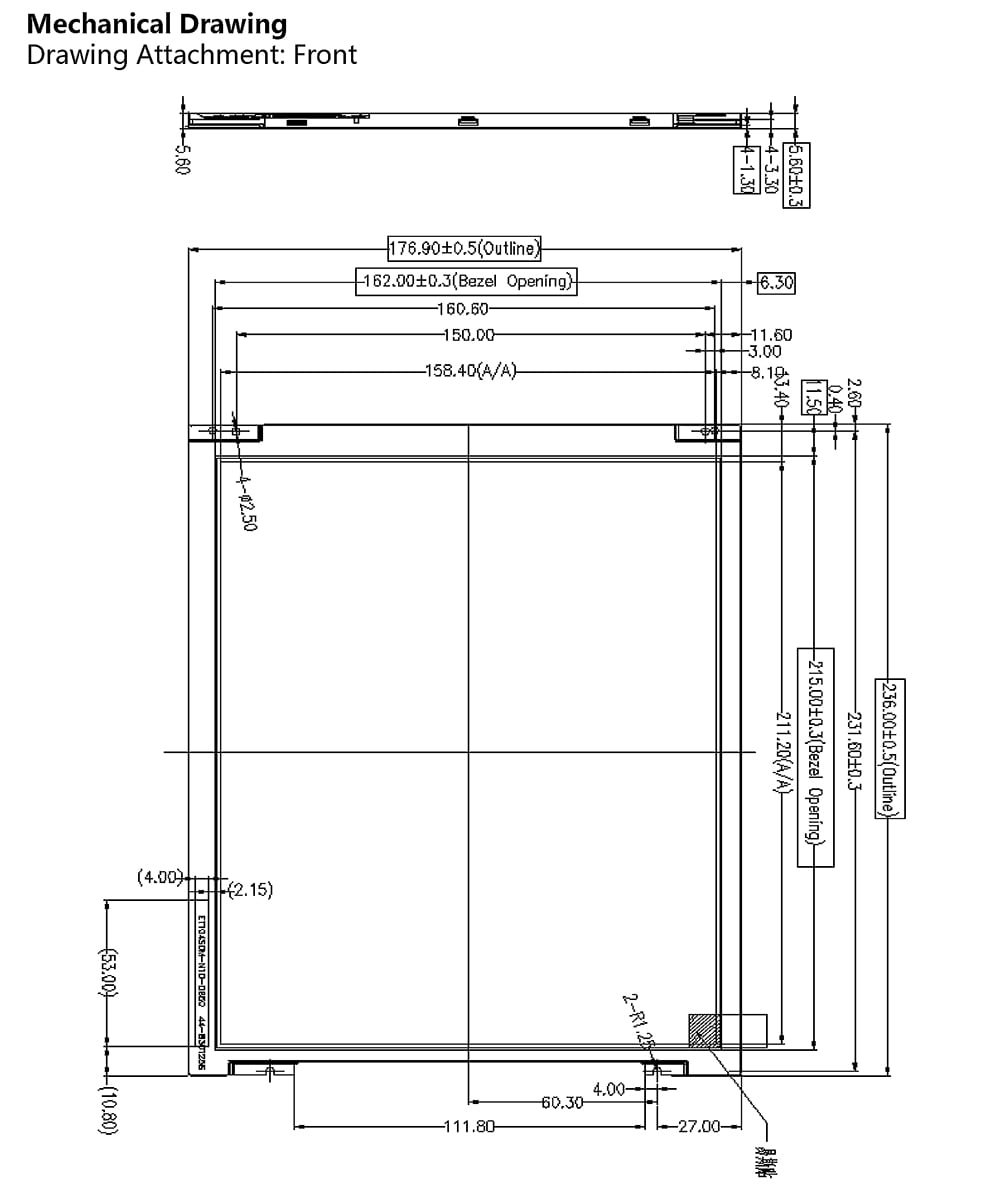 | Outline Dimension | 236(H)*176.9(V)*5.6(typ)(LCM) |